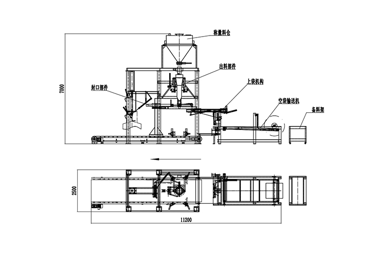 全自動機器上袋氧化鋁噸袋包裝機主要機構(gòu):氧化鋁空袋輸送機構(gòu)、自動上袋機構(gòu)、氧化鋁自動稱量機構(gòu)、氧化鋁自動灌裝機構(gòu)、自動熱合封口、自動噴碼打印、氧化鋁自動輸送機構(gòu)。簡略圖紙如下: